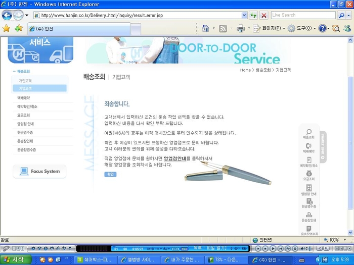 방금 마이페이지 에서 한진택배 배송조회 글자를 클릭했더니 한진택배 사이트가 뜨면서 배송조회가 불가하다는 말만 나왔습니다.