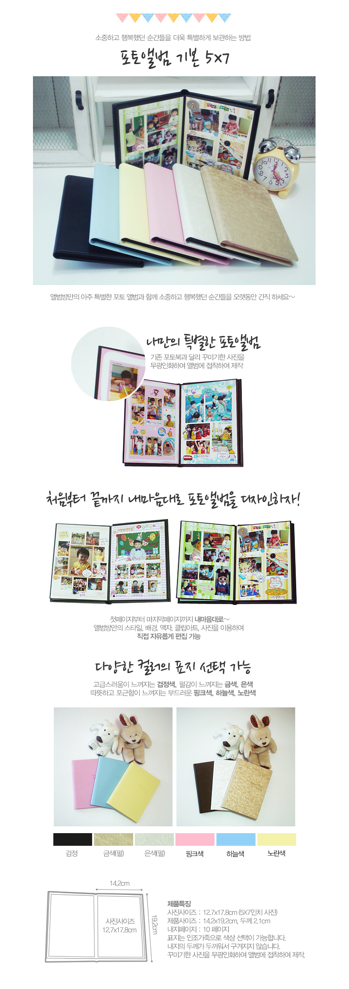 내지는 10페이지이며 두꺼워서 구겨지지 않습니다. 꾸미기한 사진을 무광인화하여 앨범에 접착하여 제작. |