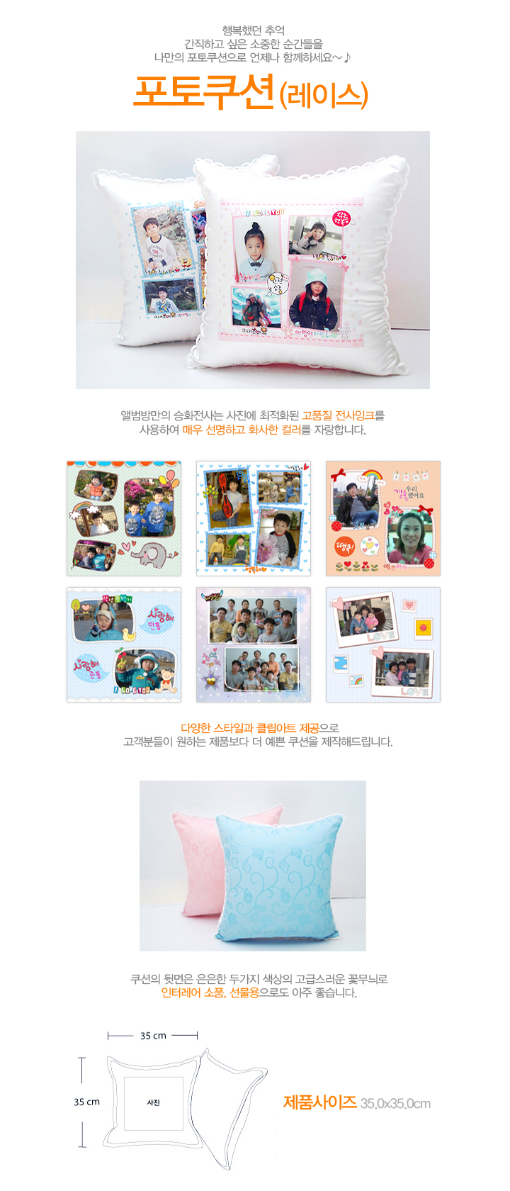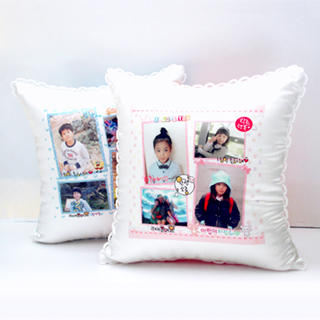 뒷면 핑크색, 하늘색중 선택가능. 테두리 레이스 장식. 빵빵하고 복원력이 좋은 A급 쿠션솜만 사용. 사진에 최적화된 고품질 전사잉크를 사용하여 선명함. |