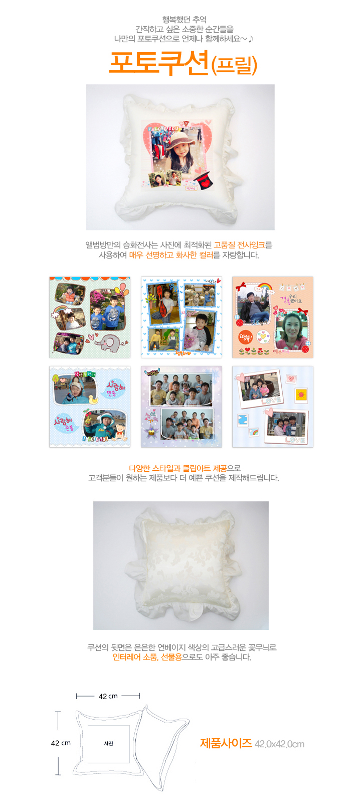 뒷면 연베이지 꽃무늬. 테두리 고급 프릴 장식. 빵빵하고 복원력이 좋은 A급 쿠션솜만 사용. 사진에 최적화된 고품질 전사잉크를 사용하여 선명함. |